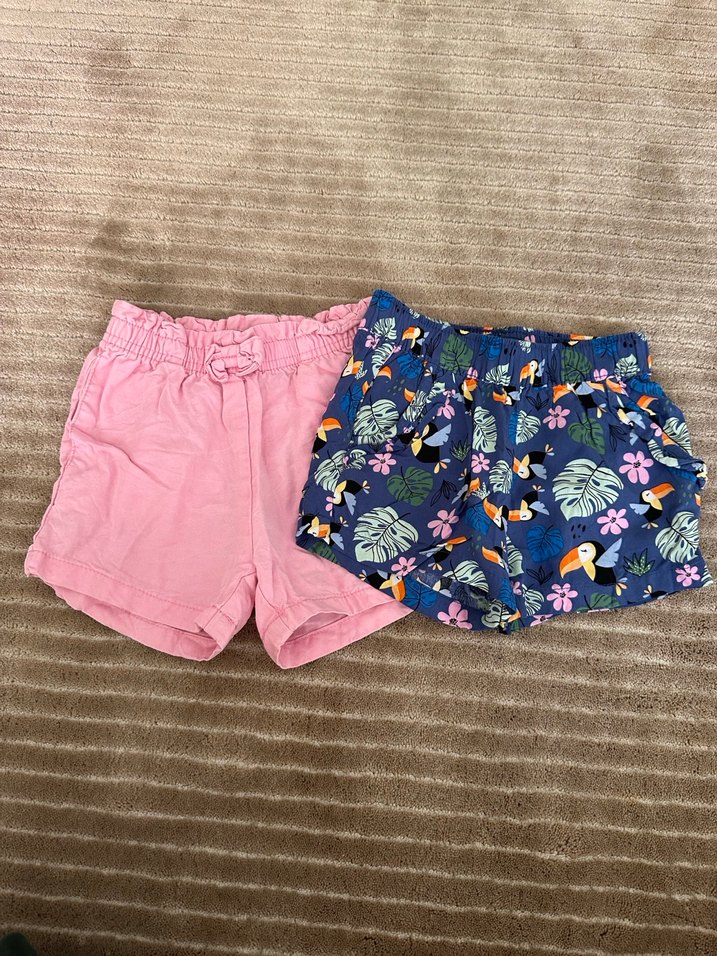 Kız çocukları için elastik bel bantlı, rahat loose fit şortlar. Biri pembe tie-dye desenli, diğeri renkli tropikal desenli. Yumuşak pamuk kumaştan üretilmiştir.
