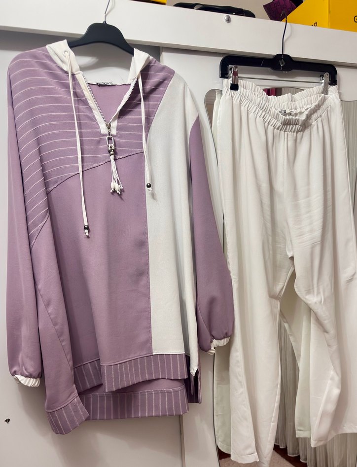 48-50-52 uyumlu Göğüs ölçüsü 65cm Pantolon bel lastikli basen 65cm Tunik kapüşonludur Dökümlü kumaştır harika bir lila beyaz ton