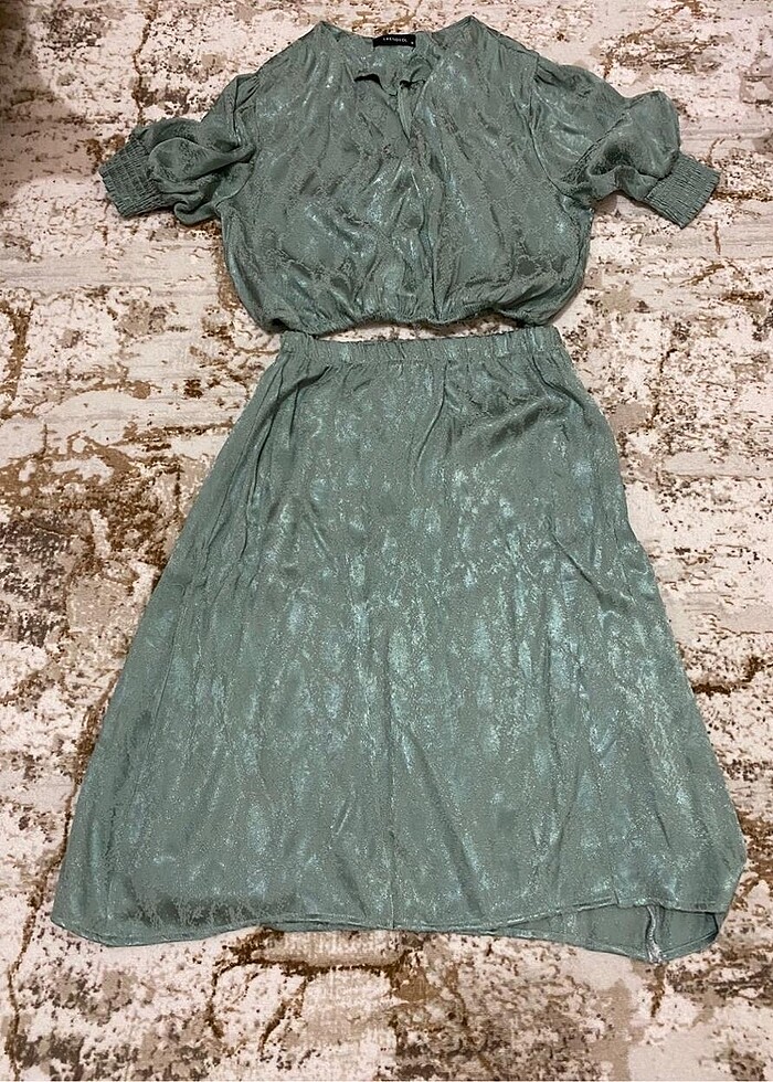 Sorunsuz, kumagi iç göstermez.36-38 beden.Islemeli parlak bir kumasi mevcut.Üstü büstiyer olarak da kullanilabilir.Ozellikle rengi ile ilgili hos yorumlar aldim.