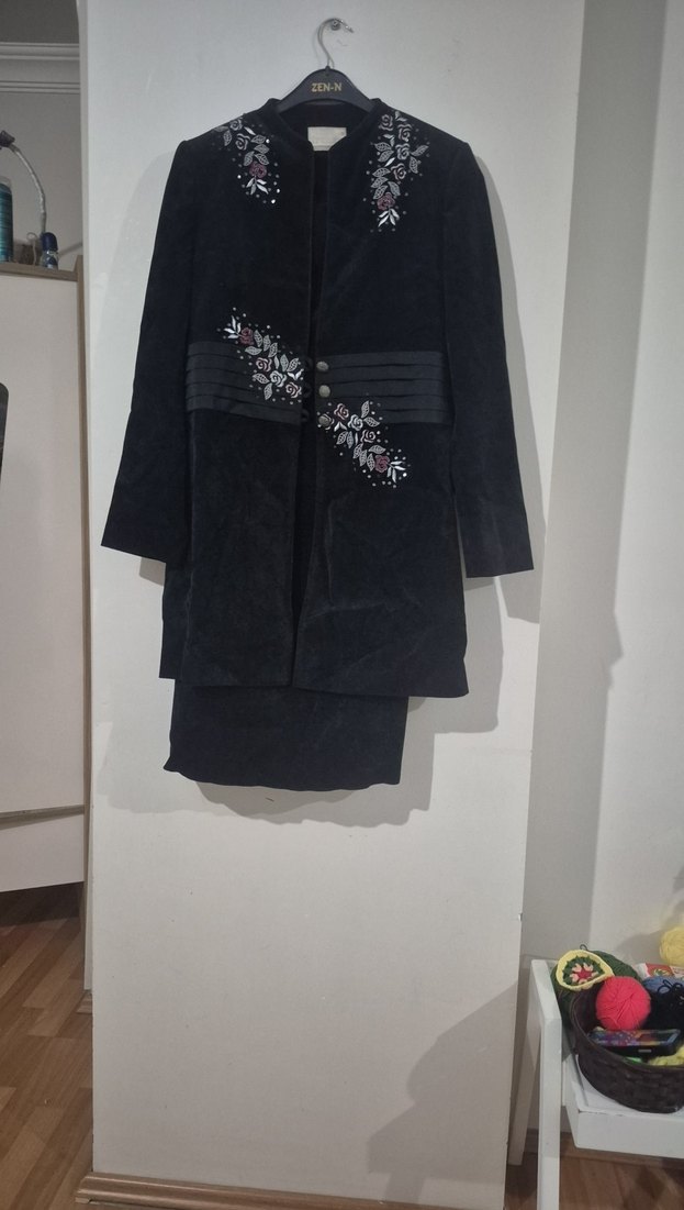 Kadınlar için uzun kesim, kesik yakalı ve regular fit süet malzemeden yapılmış siyah takım. Nakışlı detaylar ve kemerli bel ile ofis için uygun. ETEK TAKIM