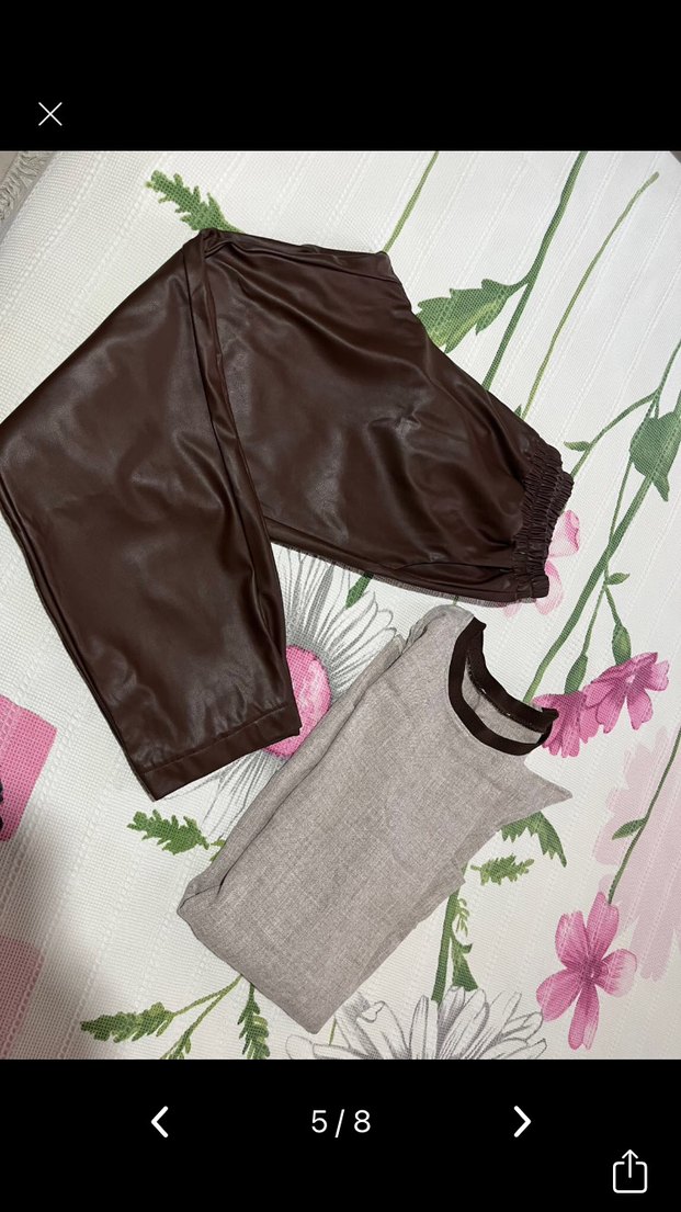 Deri alt ve deri detaylı üst takım, kahve bej, 42 beden, 40 42 uygundur, satılı kullanıldı, sesece bel lastik katında deri çatlagı görünüyor ama soyulan bir şey değil lastik katı kırığı sabit dıruyor dötüntü yapan dökülme değil,