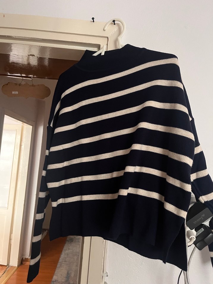 Siyah-beyaz çizgili, boğazlı, uzun kollu, yün dokuma, bol kesim triko kazak, günlük rahat Paris tarzı için uygundur. M beden için uygundur Üründe herhangi bir kusuru yoktur