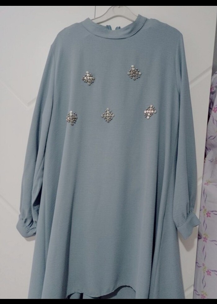 hiç giyilmedi 38 de 42 ye kadar giyilebilir beden ,alt üst ikili takım tunik arkası fermuarlı, pantolon beli lastikli boyu 102 cm ,tunik boy 92 cm arkası birazcık önden uzun ,rahat krep kumaş
