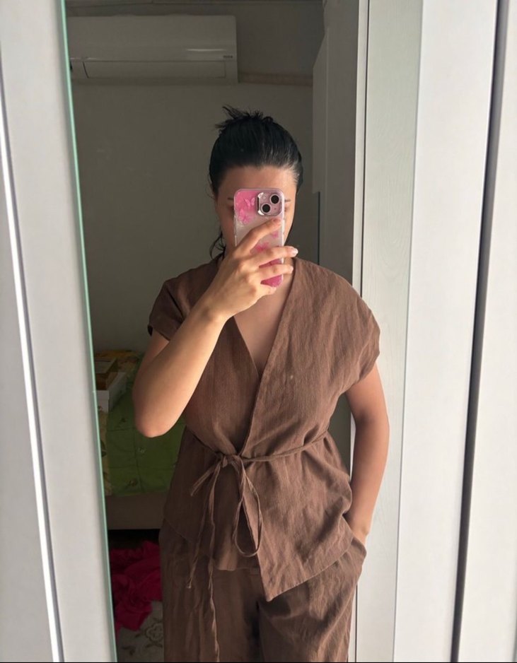 Kahverengi, midi boy, kısa kollu, minimalist ve desen içermeyen bol kesim kadın kimono. Ayarlanabilir konfor için bağcıklı bel detayına sahiptir.