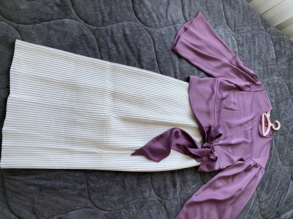 Bir kez giyildi şalını da hediye edeceğim Mor renkli, sentetik kumaştan, pilili ve uzun kesim, dar kesim hamile eteği. Çağdaş tarzıyla düğün ve şık etkinlikler için uygun.