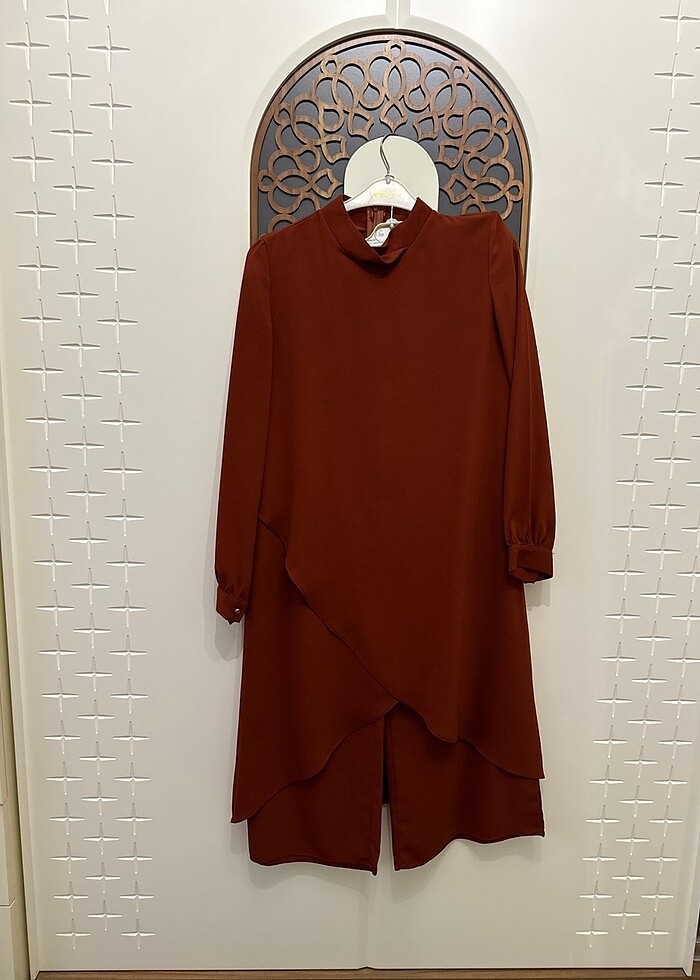 Tunik pantolon şeklindedir sayılı giyildi tertemiz. Kiremit rengini