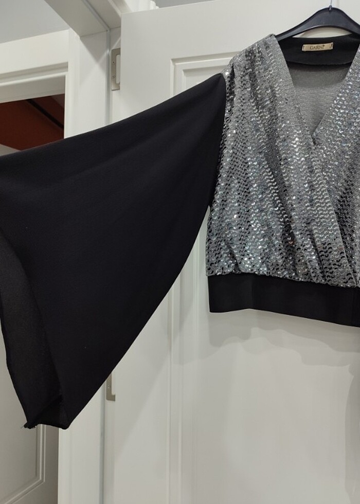 Garni marka 42 beden. İspanyol paça pantolon. Bluzun bel kısmı kalın lastikli ve bağlama detaylı. Kolları krep kumaş. 1 kez giyildi