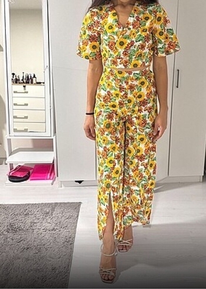 Paçasında yırtmaç detayı vardır yalnızca iki kez kullanıldı cıvıl cıvıl yaz için crop üst ve pantolon takım