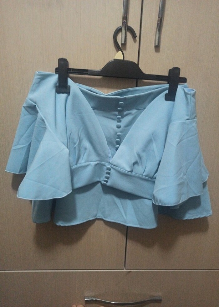 Bebe mavisi ,etekli,çok şık takım. Sıfır.Hiç giyilmedi. Etiketini koparmıştım. 42 beden