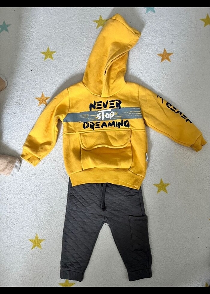 Sıfır ayarındadır. 6-9 ay bedenlidir. Ben takım yapmıştım. Alt eşofman Koton marka üstü hatırlamıyorum.