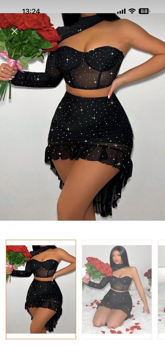 Siyah straplez, askılı kısa elbise, parlak puantiyeli ve sırtı volanlı, gösterişli parti tarzı için uygun. Parlaklık ve şıklık sunar. ✨ Siyah renkli, tek omuzlu, mini etekli şık kostüm. Özel günleriniz için ideal. iki defa tek kullanıldı daha yepyenidir Likralıdır esnektir