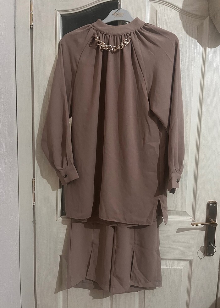 Ürün 38 40 beden uyumludur temiz durumdadır ölçüleri alt parça: boyu 100 santim basen 53 santim Üst parça: boy enseden etek ucuna 81 cm göğüs 56 cm açık kahverengi rengindedir
