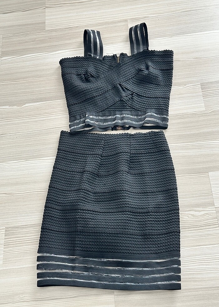 Crop top çapraz detayli, etek şerit desenli. Özel günler, davetler ve şık kombinler için mükemmel bir takim.M-L uyumlu
