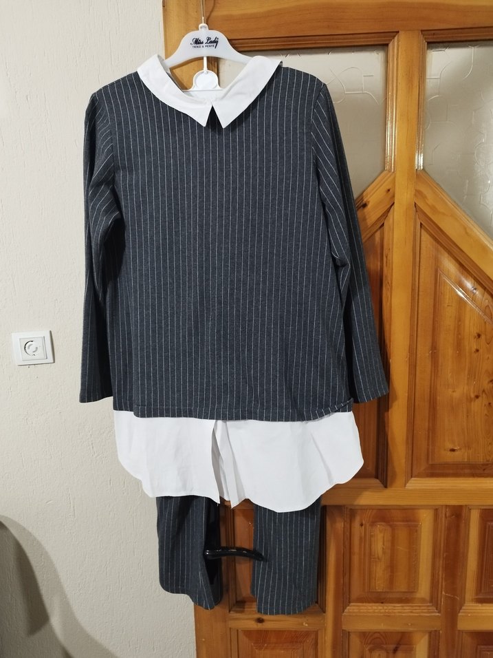 Gri renkli takım, regular fit kesim, uzun kollu ve yakalıdır. Beyaz gömlek detaylı katmanlı görünümü ile trend bir tarz sunar.