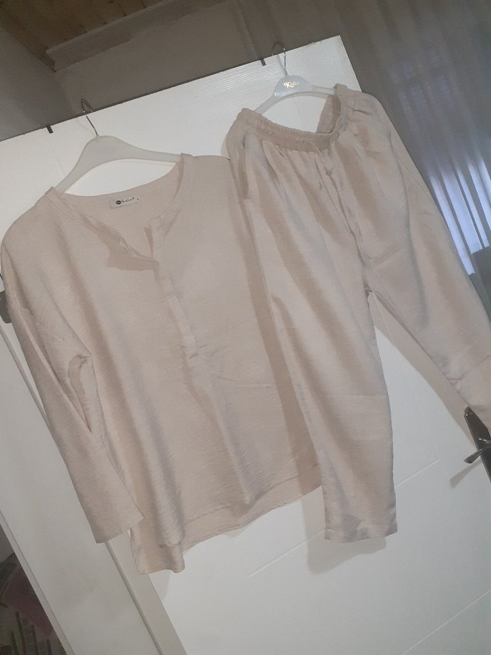 Bej keten kumaştan, uzun kollu, V yakalı, rahat kesim kadın gömlek. Minimalist ve düz tasarımlı, günlük kullanıma uygun. cok guzel iki 3 kez giyildi bi sorunu yok L XL bedene olur marka temsili