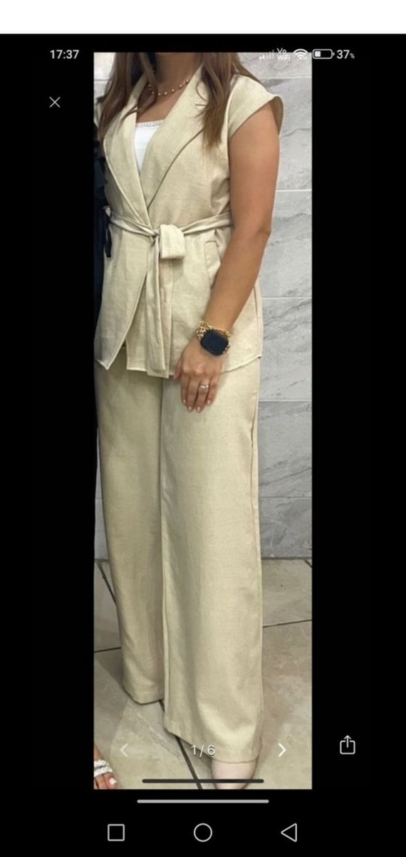 Bej renkli, kolsuz, kemerli uzun ceket ve pantolondan oluşan kadın takımı, yumuşak keten kumaştan üretilmiştir, ofis için uygundur.