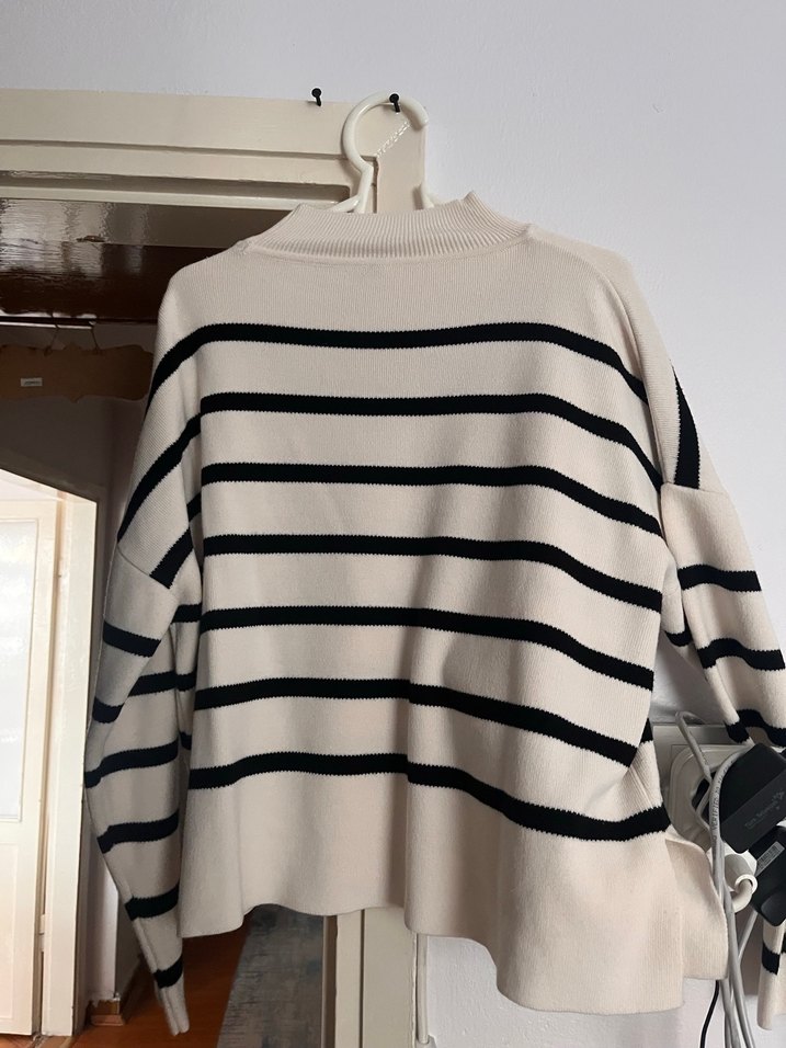 Boğazlı, uzun kollu, çizgili desenli ve bol kesim örme kazak. Yumuşak sentetik kumaştan yapılmıştır, günlük kullanım için uygundur. M bedendir Üründe herhangi bir sorun yoktur
