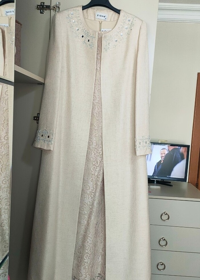 44 beden 1 defa düğün için giyildi içi kolsuz elbise üzeri boydan kaftan krem rengi tertemiz. elbisenin içi astarlı ceketin yaka ve kolunda sadece bir inciden işlemesi mevcut
