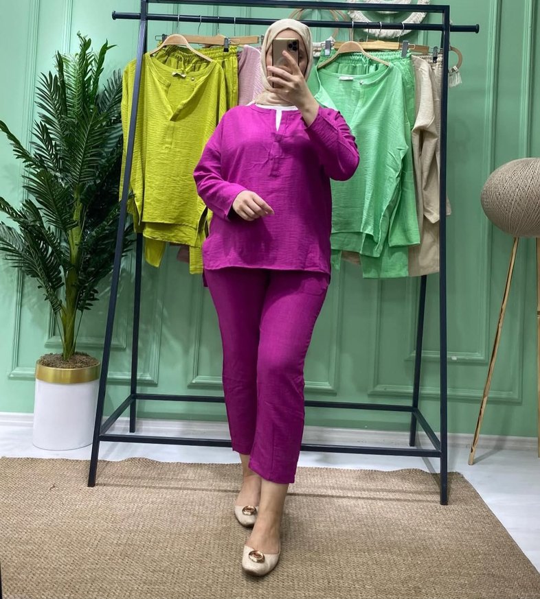 Mor renkte, uzun kollu, yüksek yakalı salaş kesim ve batik desenli, yumuşak sentetik kumaştan günlük kullanıma uygun tunik.