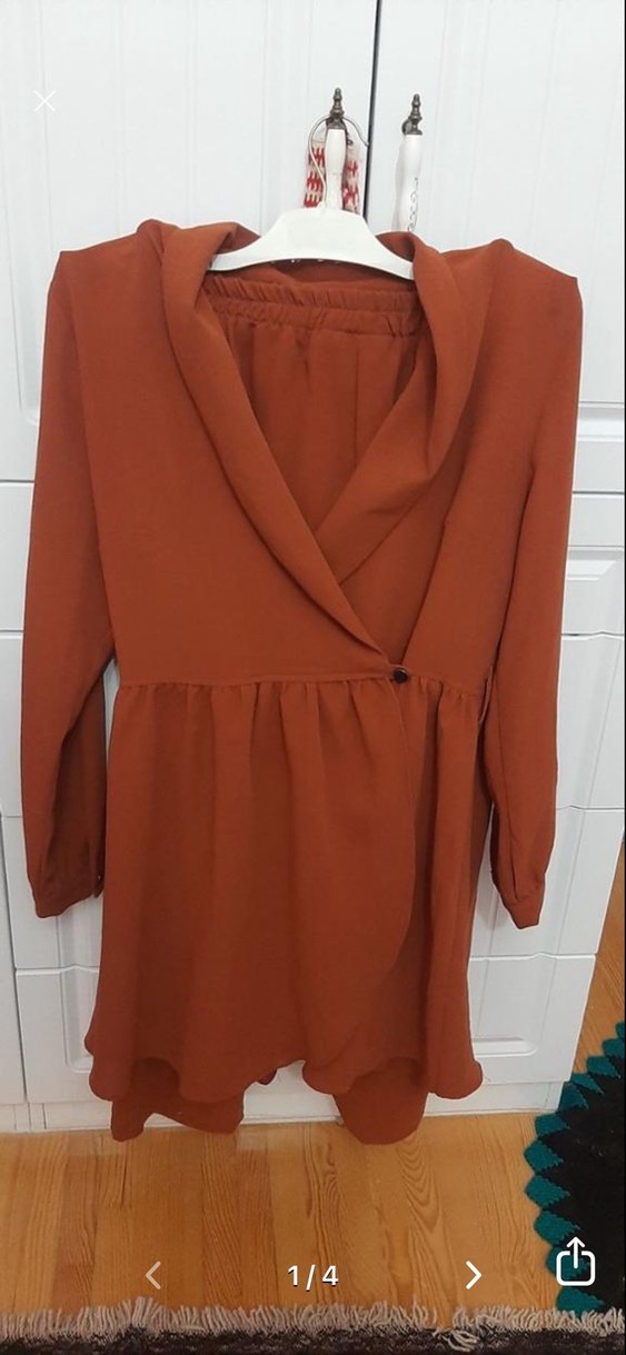 Kadınlar için uzun boylu, kahverengi ve salaş kesim elbise. Uzun kollu, desen içermeyen minimal ve çağdaş tasarım sunar.