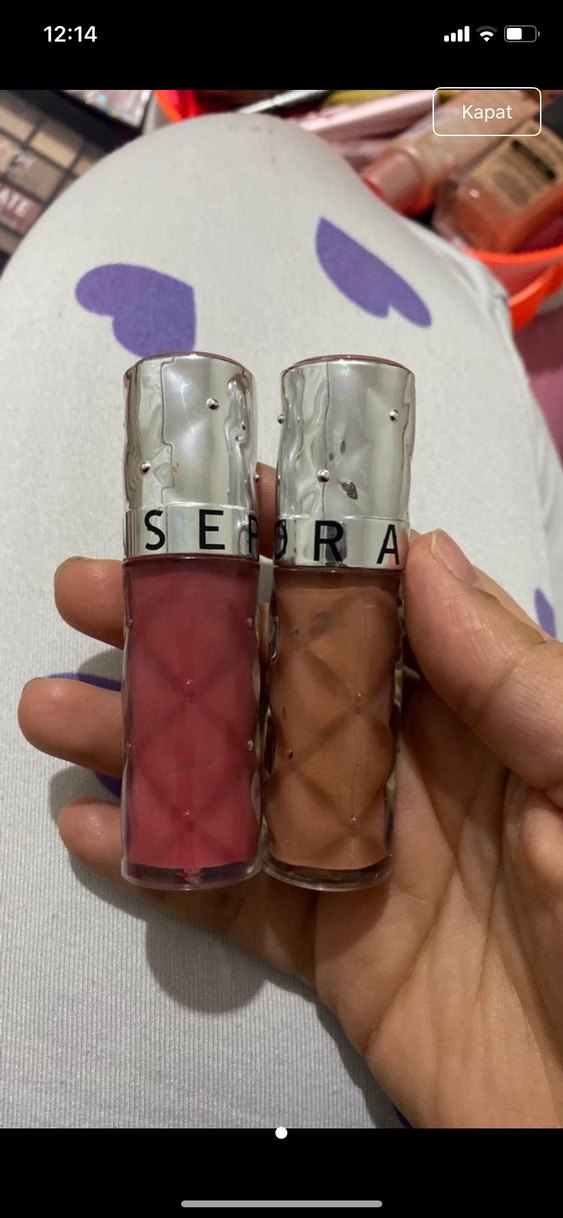 Parlak bitişli bej dudak parlatıcısı, üzerinde "SE" harfleri bulunan şık gümüş kapaklı.