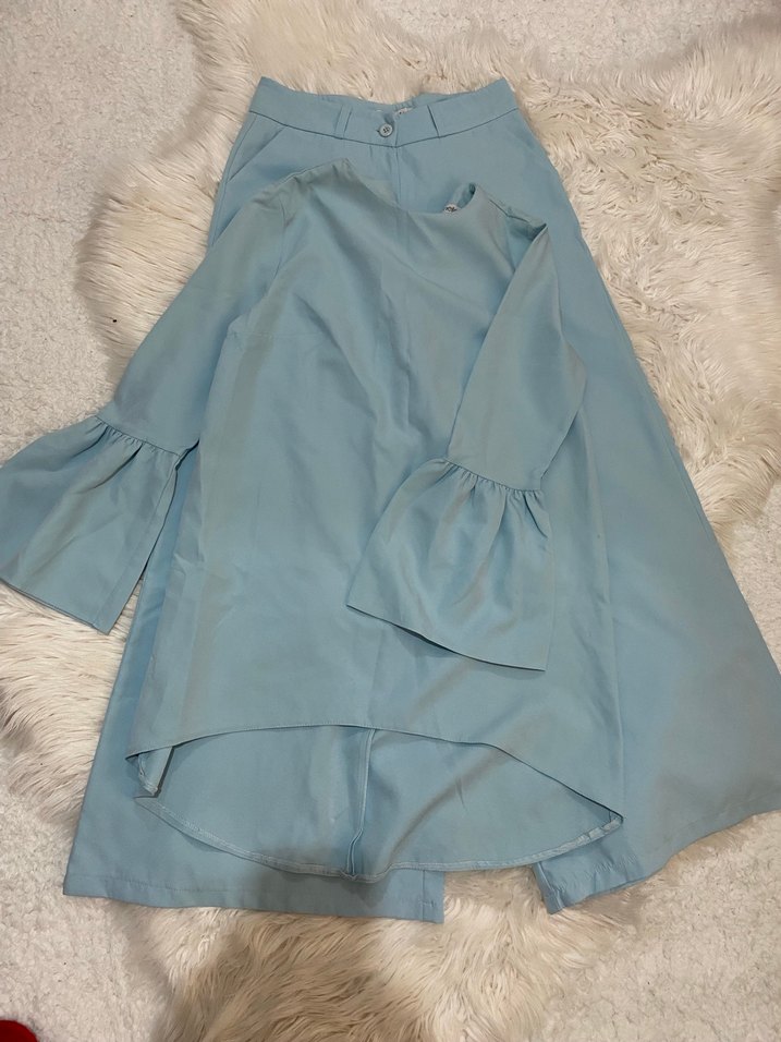 Pastel mavi renkte, uzun kollu, yüksek yakalı, dökümlü . Yumuşak sentetik kumaştan, rahat ve bol kesimdir. Bir kere kullanıldı