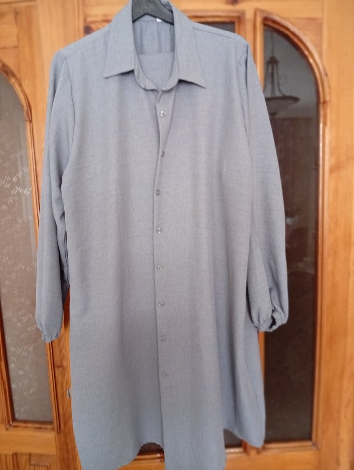 Gri renkli, uzun kesim ve bol kesim tunik gömlek. Pantolonun beli laslikli bol paçadır.