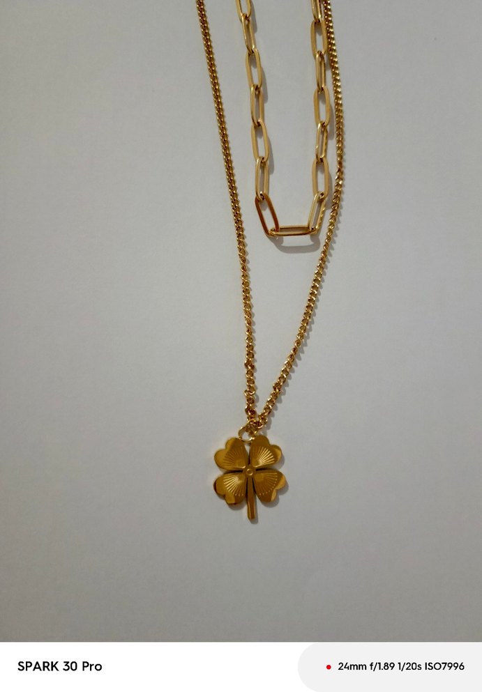 Altın renkli, ikili kolye detaylı zincirli ve minimalistik yonca kolye. Normal midi uzunlukta, günlük kullanıma uygun