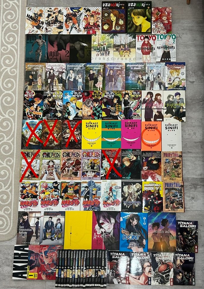 Mangalarımı 2.el olarak uyguna satıyorum. Kenarlarında köşekerinde ufak telef hatalar olabilir hepsini kotnrol etmedim yıllardır kitaplığımda duruyor. İlgilendiğiniz mangalar için yazarsınız ayrı ilan açılır. Fiyat öylesinedir. Jjk 2.cildin üzerine kahve döküldü onu ücretsiz veriyorum 5 cilt manganın altı için ilan açamıyorum maalesef kargo masrafımla kazandığımı karşılamıyor! BU İLANI ALMAYIN!