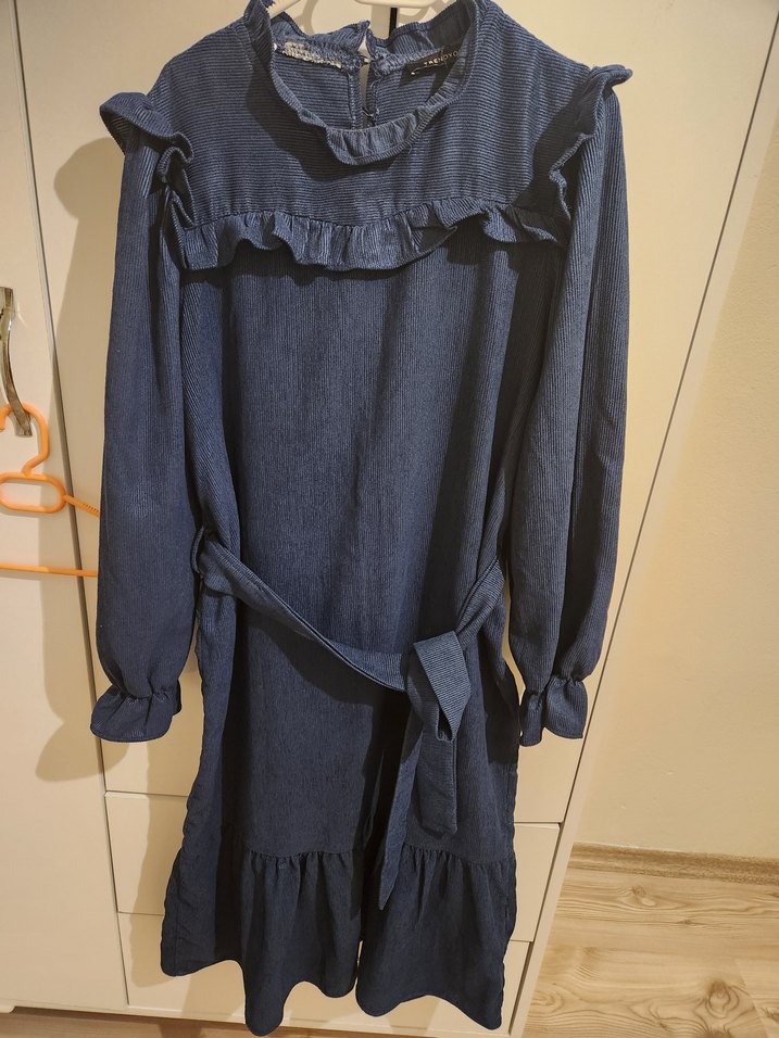 Lacivert ve haki renk , yüksek yakalı ve kadife uzun bayan elbisesi. Fırfır detaylı, bol kesim ve belden bağlamalıdır. Trend sokak tarzına uygundur.