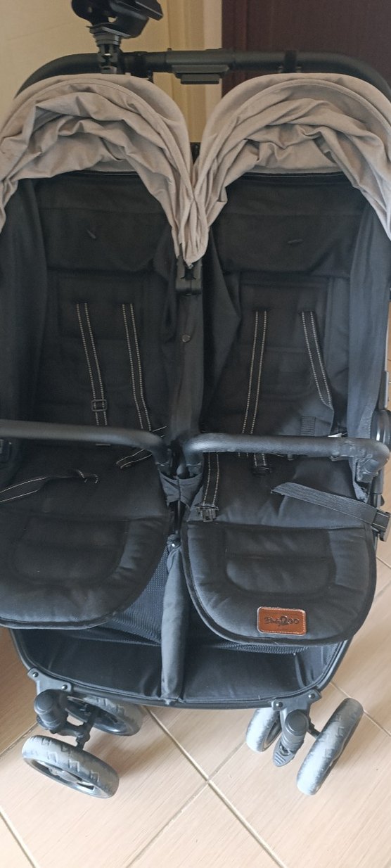 İki çocuk için yan yana siyah oturma yerleri, emniyet kemerleri ve yastıklı kolluklar bulunan çift kişilik bebek arabasıdır. Dayanıklı yapıya sahiptir.