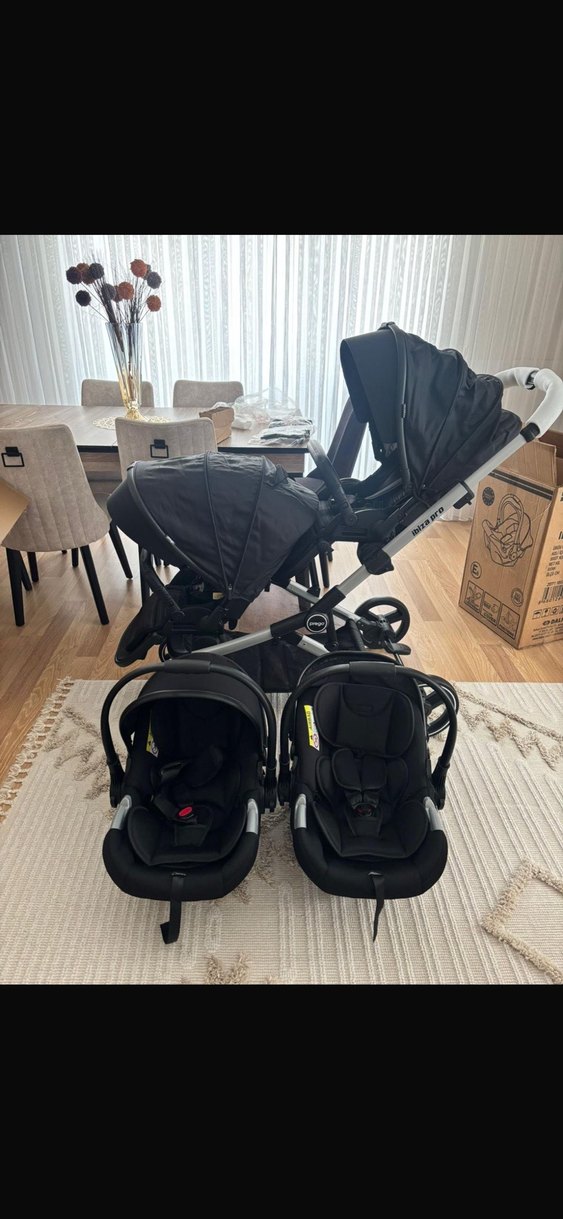 İki siyah oturma alanı ve gri detaylara sahip sağlam çerçeveli ikiz bebek arabasıdır. Altında geniş saklama sepeti bulunur ve kolay hareket için pürüzsüz tekerlekleri vardır.