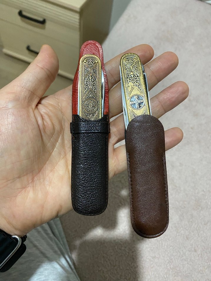 MADE İN GERMAN Alman Malı BAYER İşlemeli Pirinç Kabza, Solingen Çeliği Çift Ağızlı ve Bir Törpü. Fabrika Çıkışlı Orjinal Deri Kılıfları İle Mükemmel Koleksiyonluk Ürünler.