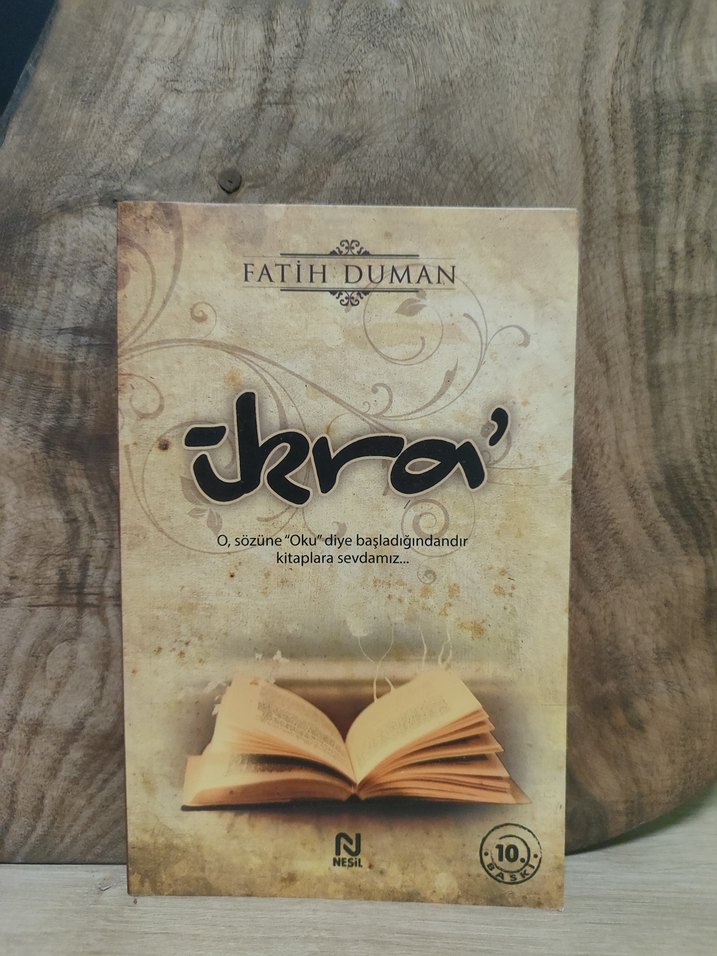 Fatih Duman'ın İkra adlı romanı, 'Oku' sözüyle başlayan kitaplara sevgiyi anlatıyor. Açık kitap görseli ve eski tarz kapak tasarımı bulunur.