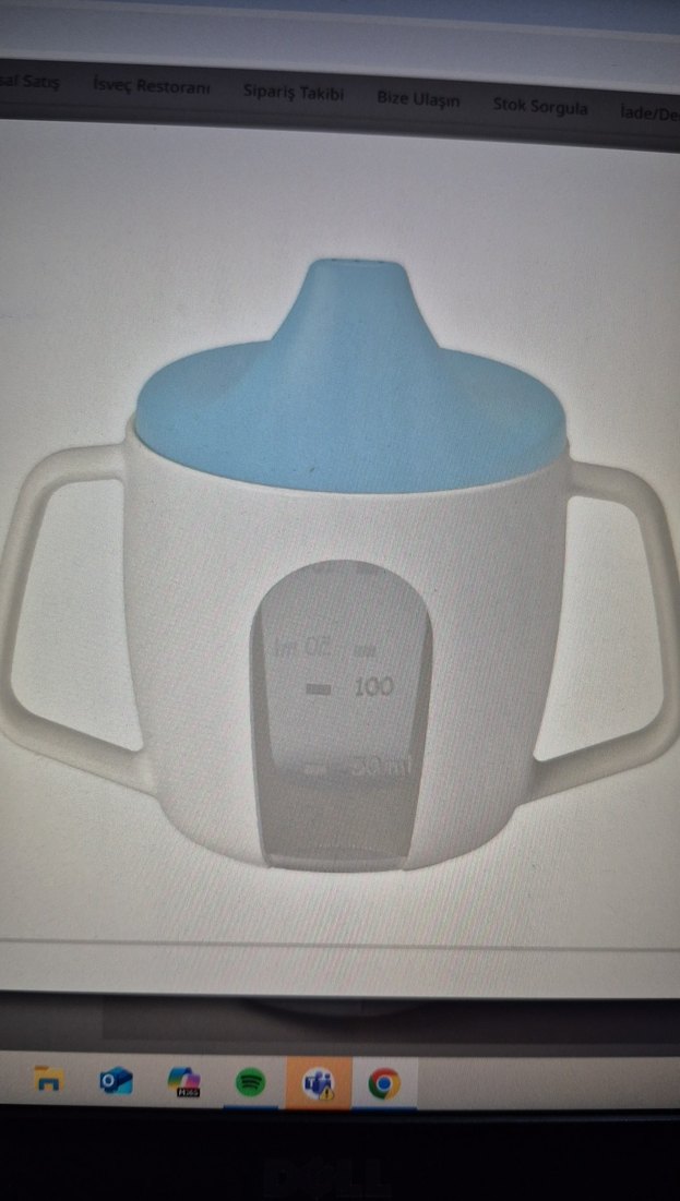 Pastel mavi kapaklı, kolay tutuşlu iki kulplu bebek suluk. 100 ml ölçü işaretli ve yumuşak uçlu.