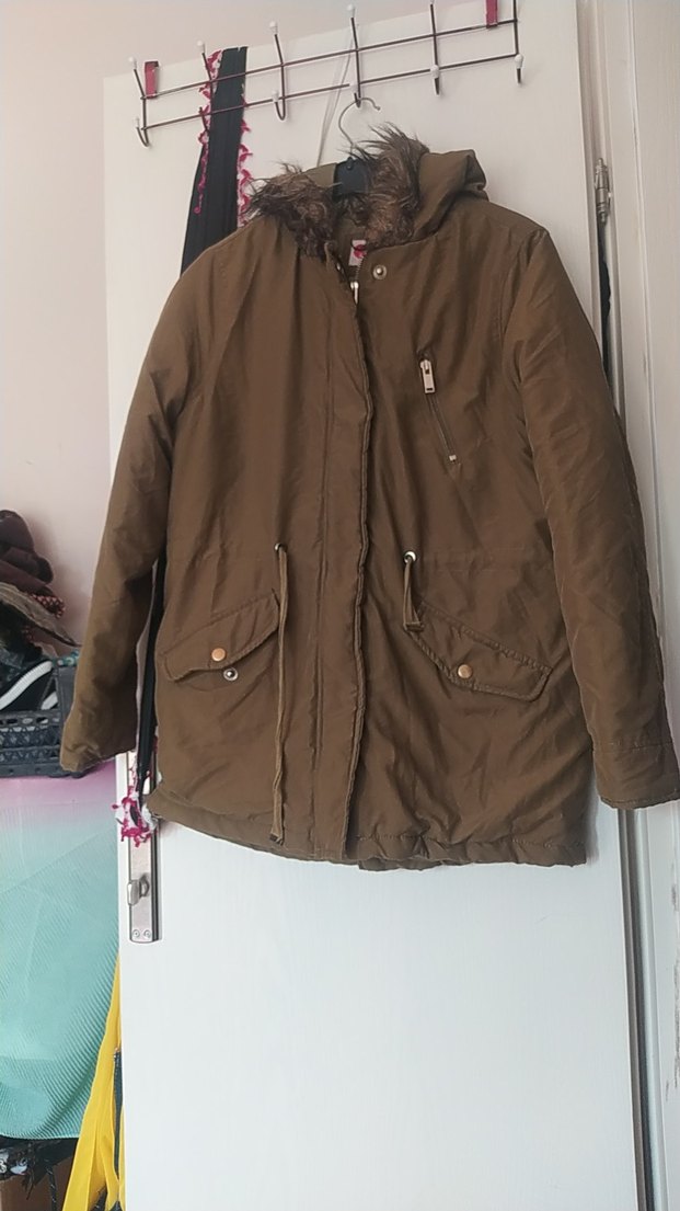 kürklü detaylı midi uzunlukta rahat kesim kadın mont. Yumuşak ve sıcak tutan kumaştan, günlük sokak stiline uygun.