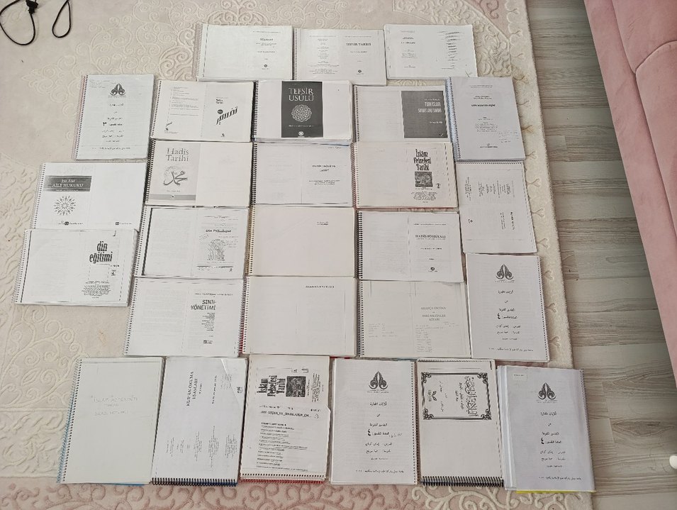Farklı konularda çeşitli yazılı ve spiralli materyallerden oluşan bir koleksiyon, yüzey üzerine serilmiş. FİYAT SORUNUZ