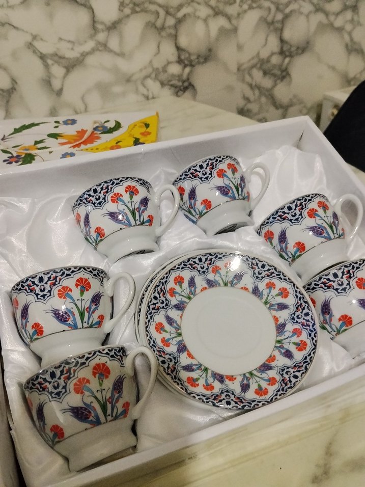 Altı adet porselen fincandan oluşan set, kutusunda renkli çiçek desenleri bulunur. Zarif içecek sunumu için uygundur. ☕