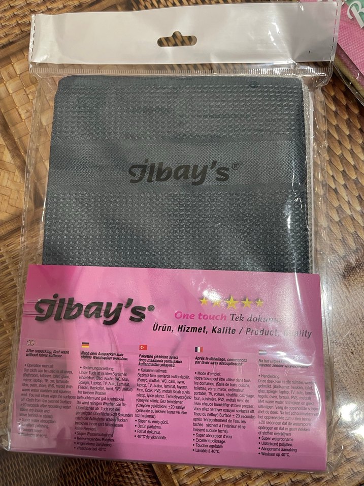 Gri renkte, baskılı biker desenli, dokulu yüzeye sahip cam bezi Ambalajında "One touch Tek dok, glbay's, Tilbay's" yazısı bulunur.