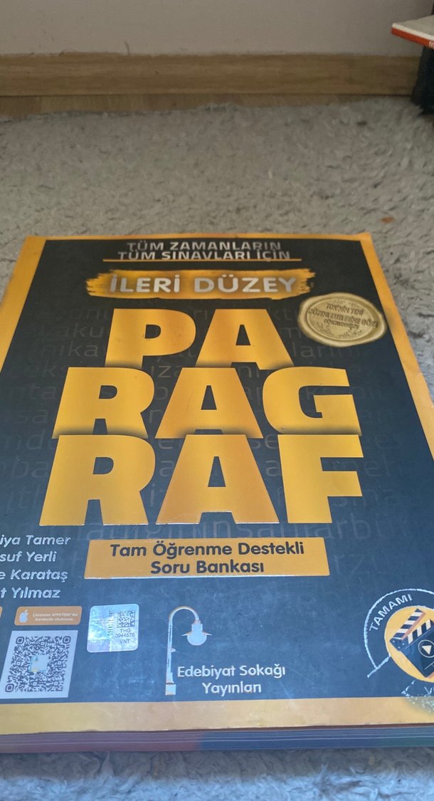 Fotoğraftaki kısıma kadar çözümlü Tam öğrenme destekli ileri düzey paragraf soru bankası, tüm sınavlara uygundur. Edebiyat Sokağı Yayınları tarafından yayımlanmıştır.