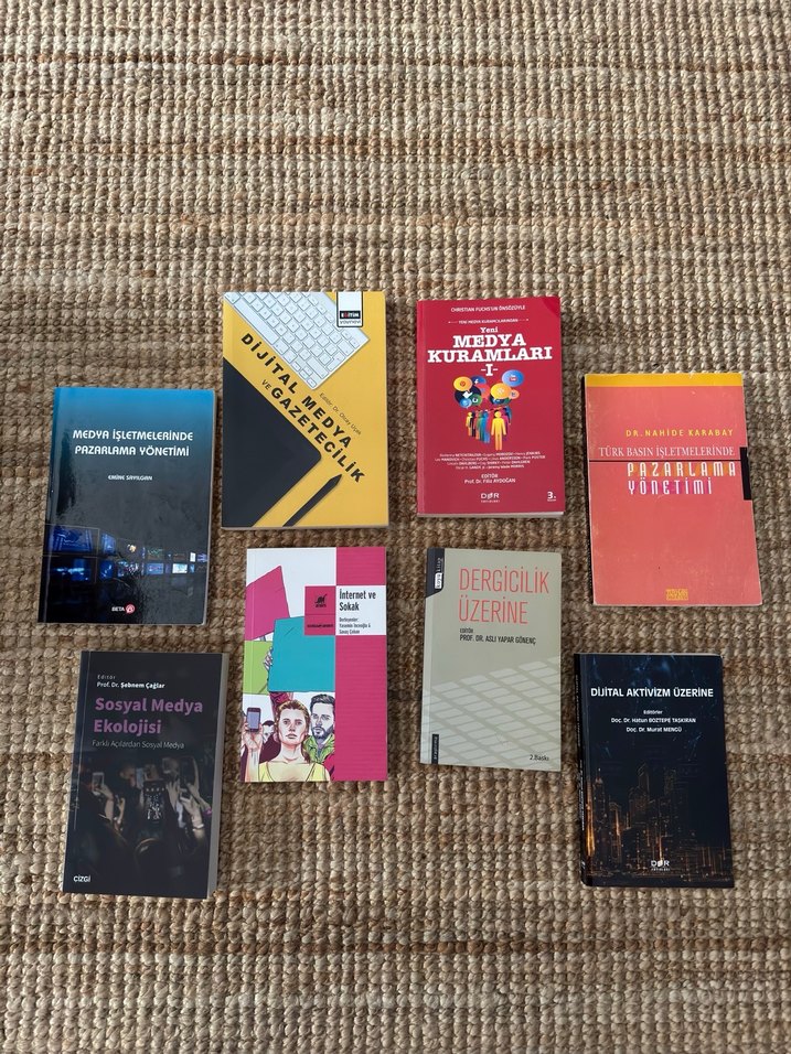 Yeni Medya Kuramları, İnternet ve Sokak, Medya İşletmelerinde Pazarlama Yönetimi, Dijital Medya ve Gazetecilik, Sosyal Medya Ekolojisi, Dergicilik Üzerine, Dijital Aktivizm, Basın İşletmelerinde Pazarlama Yönetimi kitapları. Çoğu sıfırdır. Bir iki tanesinde altı çizili yerler olabilir. İstediğiniz kitap için ilan açılır. Fiyatlar değişebilir.
