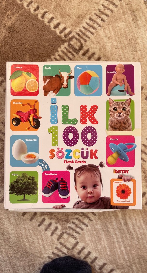 Çocukların temel kelimeleri öğrenmesi için 100 sözcük içeren renkli flash kartlar seti. Günlük nesne ve hayvan resimleri bulunur.