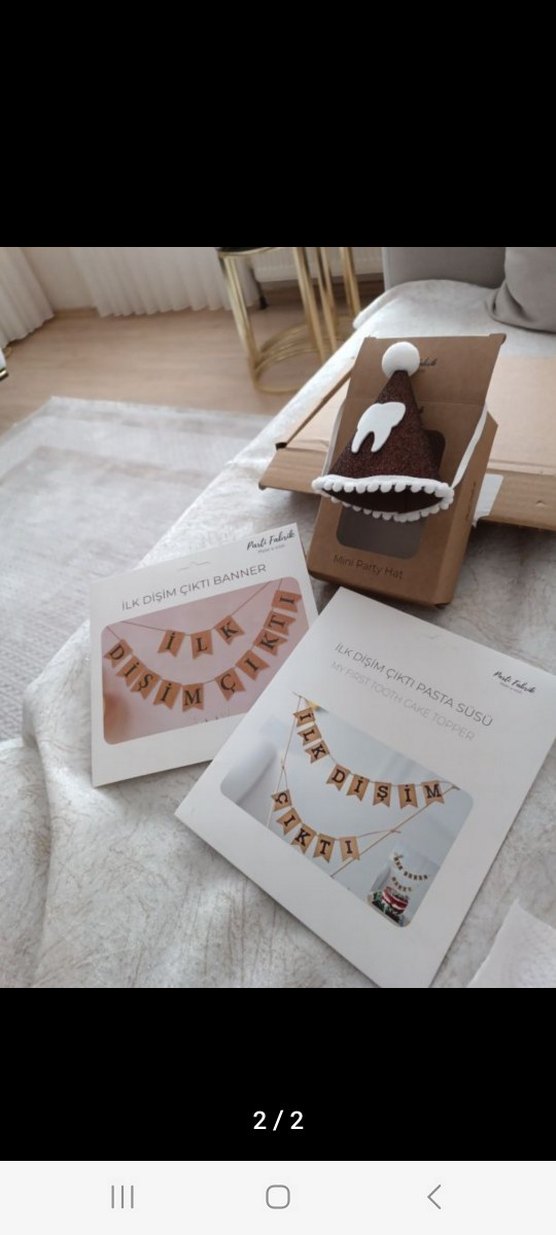 Pastel bej renkte, diş temalı kedi aksesuar seti. İlk dişim çıktı yazılı süs ve diş figürlü parti şapkası içerir.