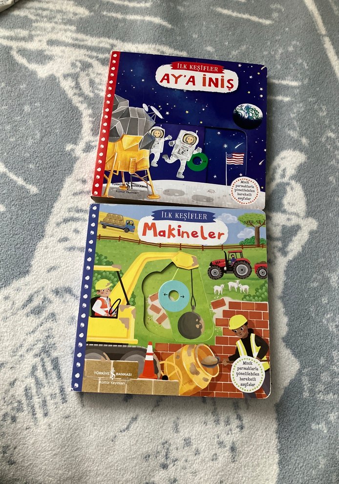 'İlk Keşifler' serisinden 'Ay'a İniş' ve 'Makineler' adlı iki çocuk kitabı, ay inişi ve makineler hakkında eğitici içerikler sunar. Üstekinin bir sayfasında sorun var görselde bellidir. Makineler ise tertemiz kullanıldı.