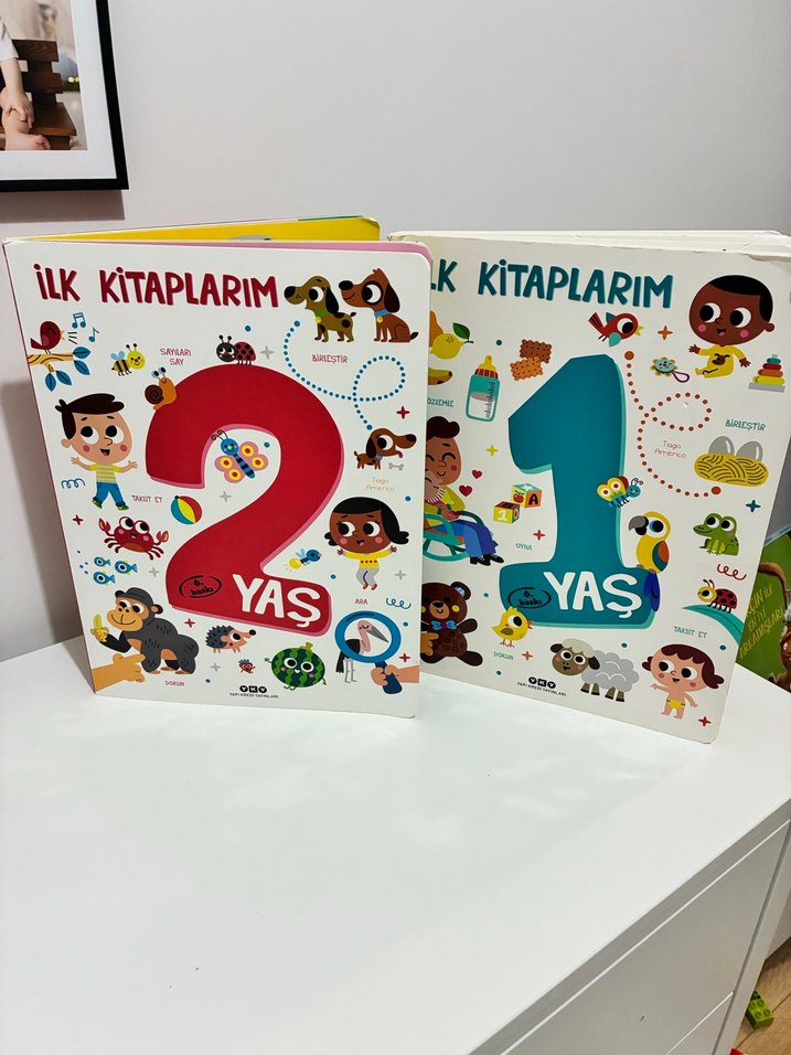 1 ve 2 yaş çocuklar için 'İlk Kitaplarım' adlı, renkli çizimlerle ve basit öğrenme içerikleriyle dolu kitap seti. Deformeler mevcut. Yırtılmış kısımlar var.