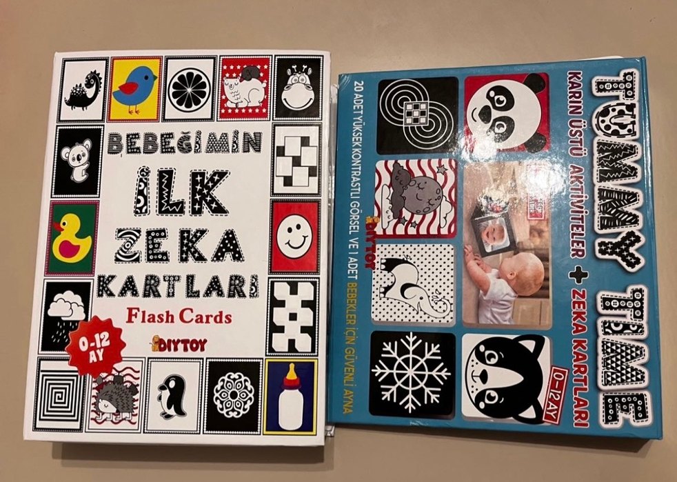 15 adet ilk zeka kartları, 8 adet tummy time kartı mevcut. Birkaç tanesinin köşesinde diş izleri var ama fotoğraflar açısından sorun oluşturmuyor. Aynalı kutu dahil