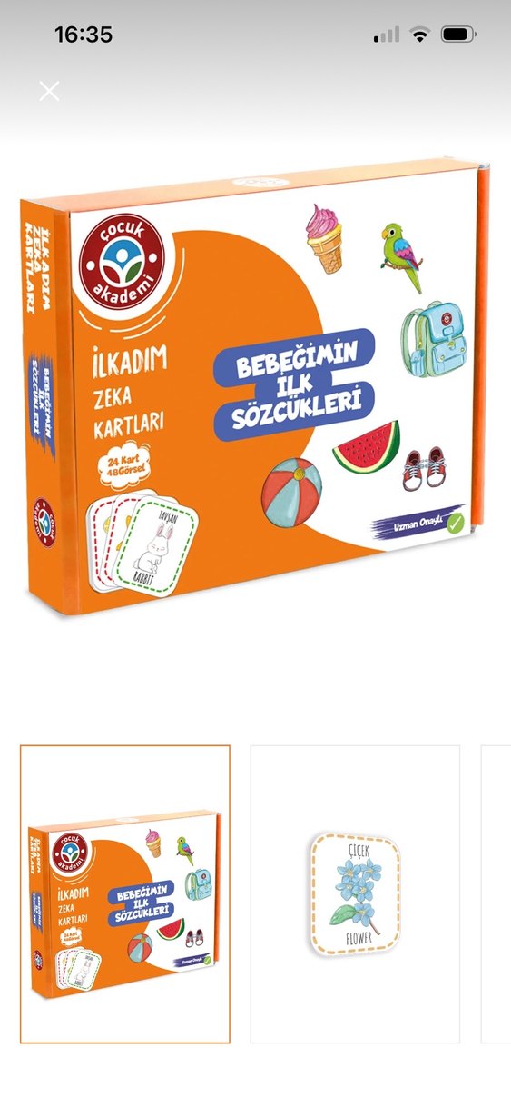 24 kart ve 48 görselli, bebeğinizin ilk sözcüklerini öğrenmesine yardımcı olan açık turuncu zeka kartları.