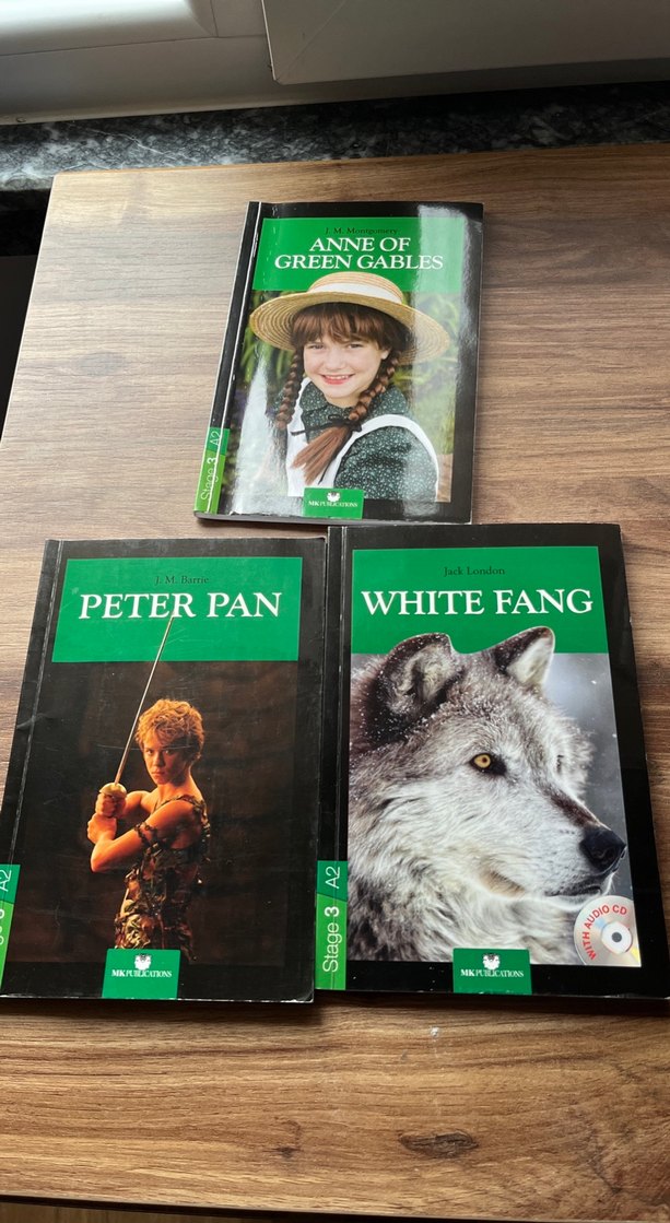 Anne of Green Gables, Peter Pan ve White Fang kitaplarından oluşan ilkokul seti. hikayeler öğrenimi destekleyen kitaplar .2kitaptakurşun kalem ile bazı kelimelerin altı çizili
