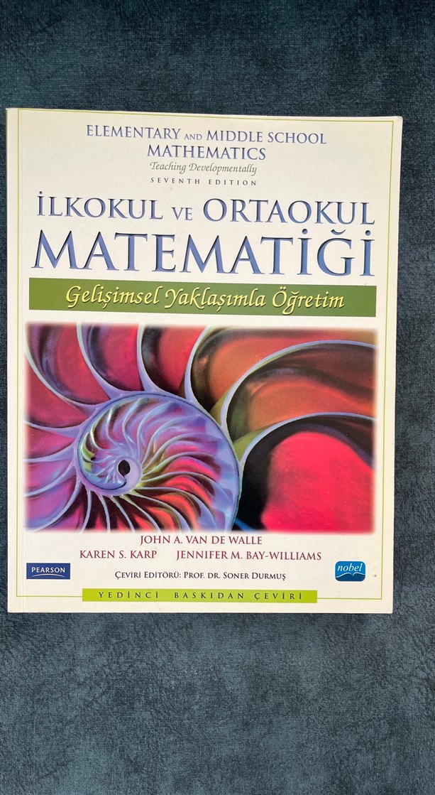 İlkokul ve ortaokul matematiğini gelişimsel yaklaşımla öğreten, yedinci baskı ve Prof. Dr. Soner Durmuş çevirisiyle hazırlanmış bir kitap. Van De Walle . Bir kaç sayfanın altı çizili sadece