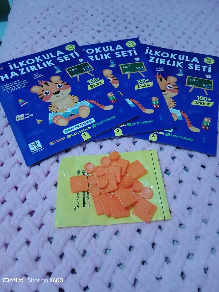 İlkokula hazırlık seti, 3 kitap ve turuncu sayı tuşları içerir. bir ve iki satıştadır kurşun kalemle yapılmıştır silinip tekrar yapılabilir